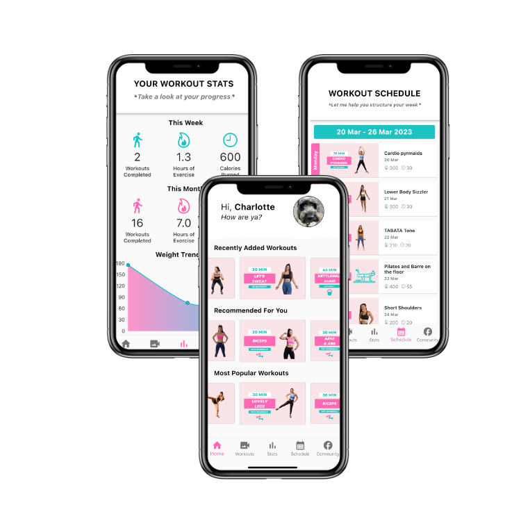 I feel like Charlotte’s workouts have changed my life. I started exercising 1 year ago and I have lost 2 stone. Not only that but I now actually enjoy exercising and that is something I never thought I’d say!! The workout schedule is my saviour, because I don’t even have to think about what I am doing - my workouts are planned for me for the week so I can just get straight into it even on days when I can’t b bothered!! Thanks so much xx